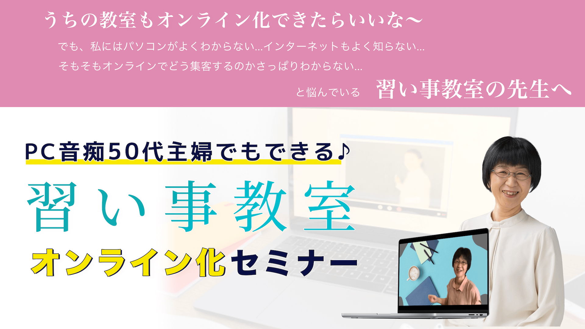 教室のオンライン化に困ったら、この、PC音痴50代主婦でもできる【習い事教室オンライン化セミナー】を活用してください。